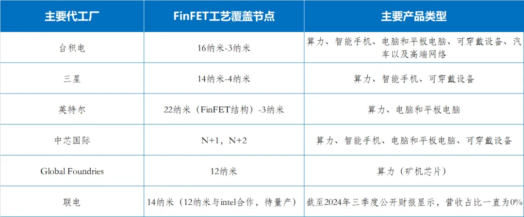 表1 全球主要代工廠(chǎng)FinFET工藝覆蓋節(jié)點(diǎn)和主要產(chǎn)品