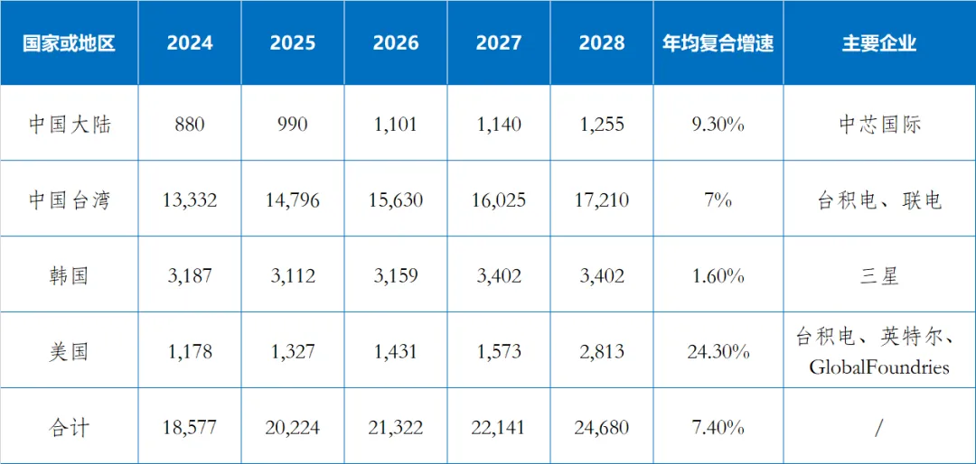 根據(jù)Gartner數(shù)據(jù),截至2024年底,全球FinFET工藝總產(chǎn)能為1857.7萬(wàn)片/月(等效8英寸晶圓)。從區(qū)域分布上看,全球僅有美國(guó)、中國(guó)、韓國(guó)及中國(guó)臺(tái)灣具備FinFET工藝的生產(chǎn)能力。從產(chǎn)能規(guī)模上看,中國(guó)臺(tái)灣產(chǎn)能占比最大,達(dá)到71.8%,而幾乎接近93%的產(chǎn)能集中在亞洲。從企業(yè)情況來(lái)看,全球僅有6家企業(yè)掌握FinFET工藝,分別是臺(tái)積電(中國(guó)臺(tái)灣)、聯(lián)電(中國(guó)臺(tái)灣)、三星(韓國(guó))、英特爾(美國(guó))、GlobalFoundries(美國(guó))以及中芯國(guó)際(中國(guó)大陸)。從產(chǎn)能增速來(lái)看,2025年-2028年全球FinFET工藝產(chǎn)能擴(kuò)充主要發(fā)生在中美兩國(guó),其中美國(guó)未來(lái)四年FinFET工藝擴(kuò)產(chǎn)年均復(fù)合增速更是高達(dá)24.3%。