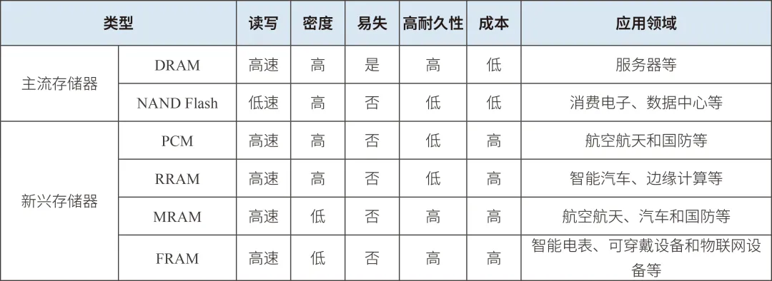 新興存儲器是指為滿足新興應用場景對數據存儲在速度、功耗、容量、可靠性等方面的更高要求而研發的新一代存儲技術。目前,主流的研究方向包括相變存儲器(Phase-change memory,簡稱PCM)、阻變存儲器(Resistive Random Access Memory,簡稱RRAM)、磁性存儲器(Magnetoresistive Random Access Memory,簡稱MRAM)、鐵電存儲器(Ferroelectric Random Access Memory,簡稱FRAM)。