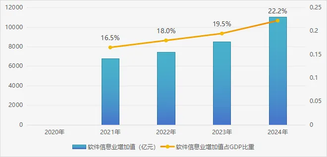 “十四五”以來,北京信息軟件業保持高速增長,成為全市經濟高質量發展的核心支撐。2021年北京信息軟件業1實現收入2.2萬億元,2024年收入突破3.3萬億元,僅用三年時間再邁上一個萬億級臺階,占全國信息軟件業比重近四分之一。2024年,北京信息軟件業實現增加值11068.8億元,同比增長11.0%,占地區生產總值的22.2%,成為全市經濟的第一支柱。