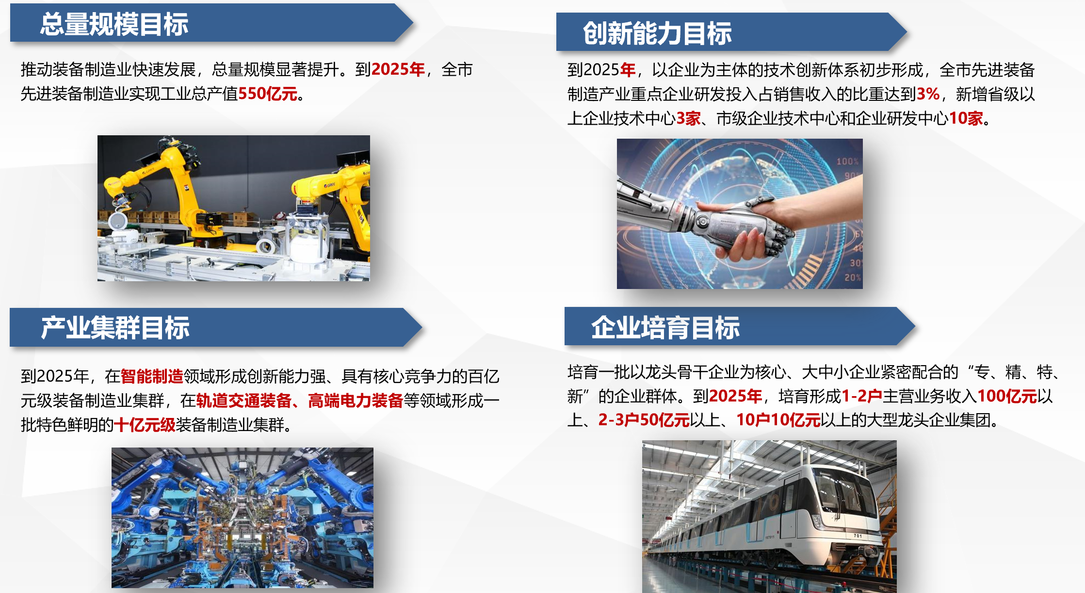 《北京市裝備制造產業振興規劃》、《北京亦莊機器人產業創新示范區產業發展規劃》、《昆明市先進裝備制造業發展規劃(2016-2020年)》《河北省遵化市應急裝備特色產業集群發展規劃(2019年—2025年)》、《北京市軌道交通產業發展規劃》