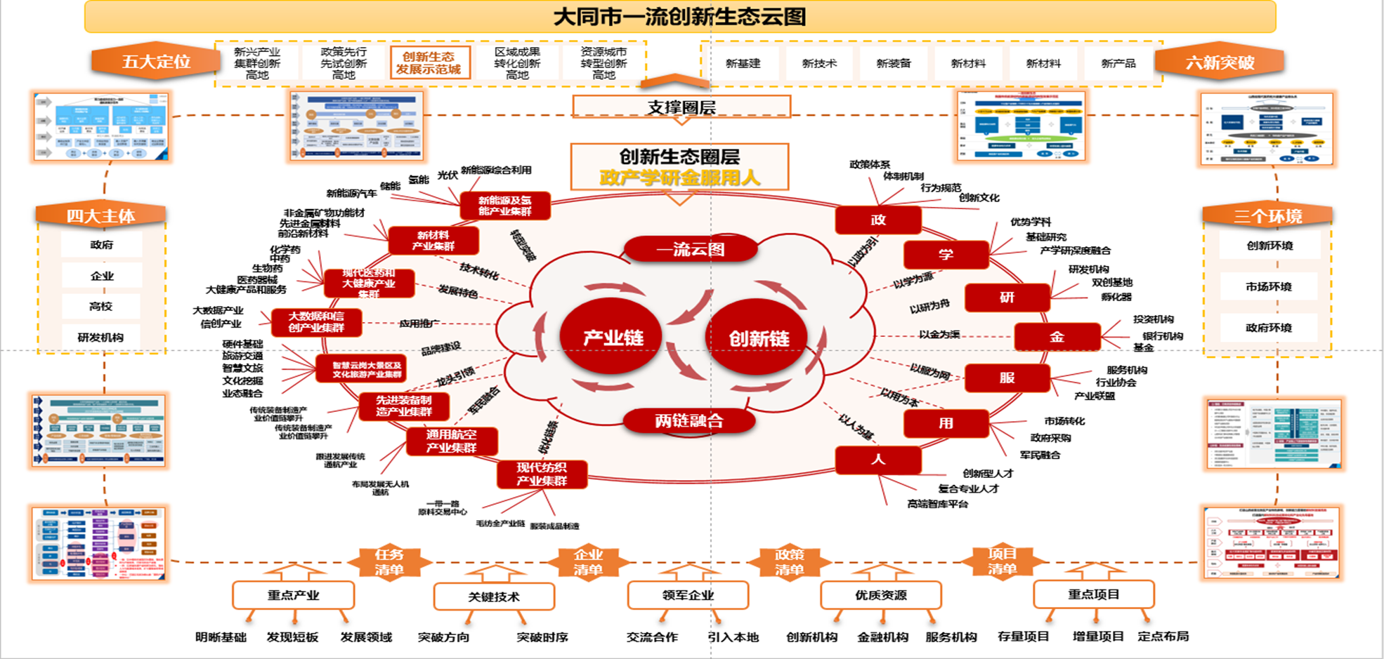 立足大同市貫徹落實國家創新驅動戰略和山西省“創新生態建設”發展要求,瞄準實現“轉型出雛型”的重要階段性戰略目標,提出以產業集群培育為主線,推進創新鏈和產業鏈深度融合,從強化高校院所活力、構建企業創新體系、激活創新消費市場、建立創新生態制度等方面入手,圍繞“政、產、學、研、金、服、用”+“人才”整合創新資源要素,構建網絡化、規模化、系統化的大同市創新生態頂層設計和作戰實施圖,指導大同市在高質量轉型發展上率先蹚出新路。
