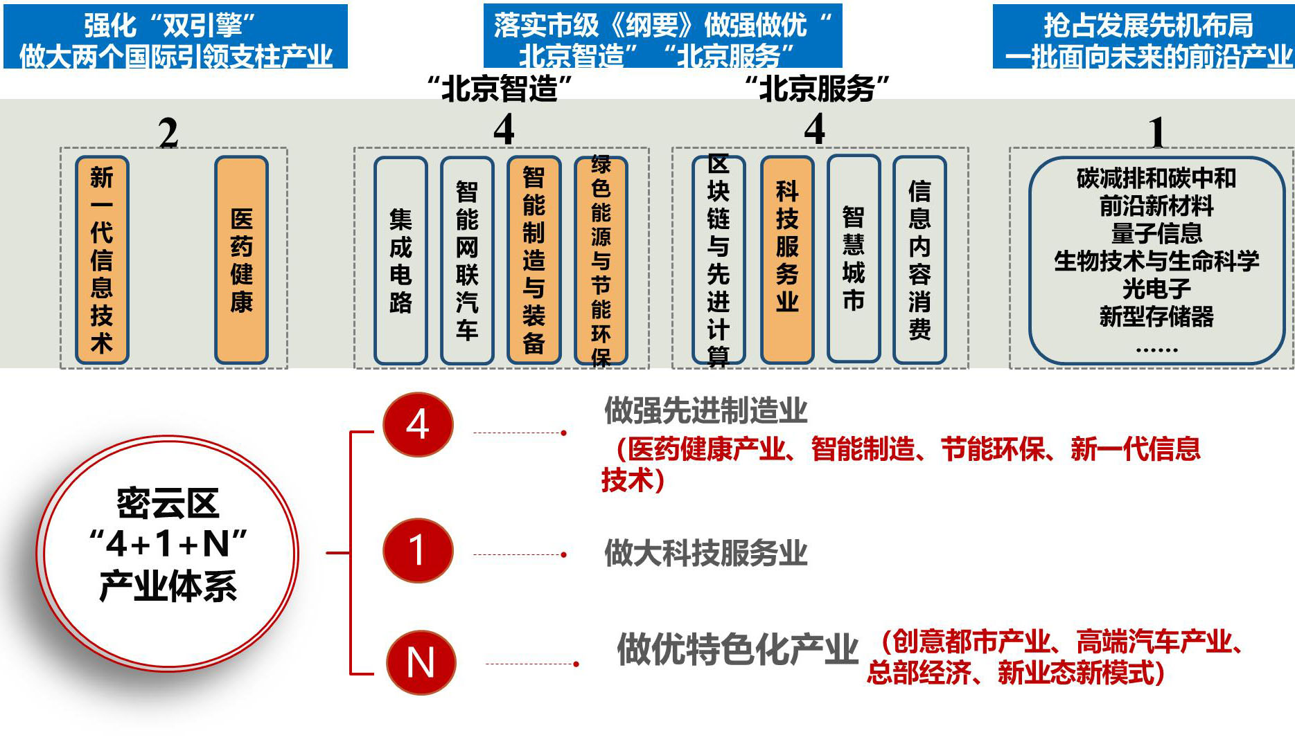 規(guī)劃梳理總結(jié)密云區(qū)高精尖產(chǎn)業(yè)現(xiàn)狀和形勢,根據(jù)市委對生態(tài)涵養(yǎng)區(qū)“不斷擴大生態(tài)環(huán)境容量和提高生態(tài)環(huán)境質(zhì)量”的新要求,提出堅持科技創(chuàng)新、生態(tài)融合兩條主線,加快推進創(chuàng)意都市、汽車零部件等傳統(tǒng)產(chǎn)業(yè)轉(zhuǎn)型升級,以醫(yī)藥健康、智能制造、節(jié)能環(huán)保、新一代信息技術(shù)產(chǎn)業(yè)為主導(dǎo),以科技服務(wù)業(yè)為支撐,以新業(yè)態(tài)、新模式為補充,構(gòu)建“4+1+N”的高精尖產(chǎn)業(yè)體系和“3+5+4”的高精尖產(chǎn)業(yè)空間體系,推動密云綠色創(chuàng)新發(fā)展示范區(qū)建設(shè)。