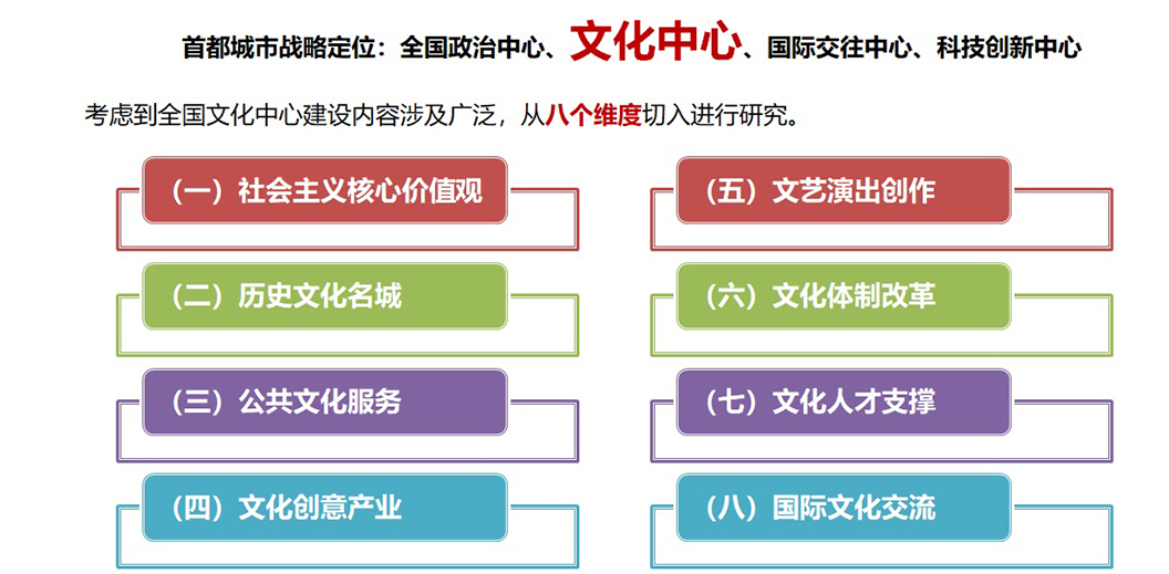 落實北京市“四個中心”城市戰略定位,從全國文化中心的內涵和要求出發,聚焦“古都文化、紅色文化、京味文化和創新文化”,明晰全國文化中心建設思路,提出發展目標,部署重點任務