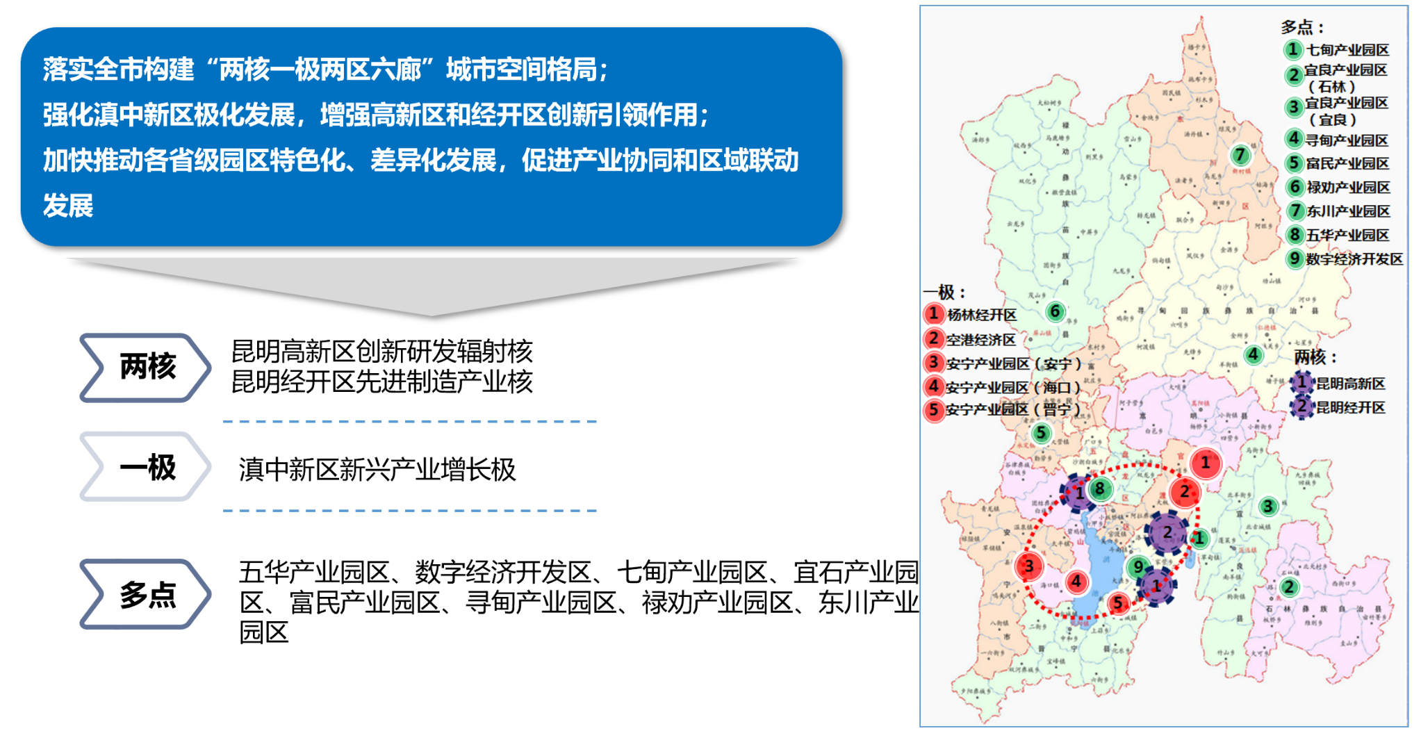 規劃貫徹習近平總書記考察云南重要講話精神,以服務昆明區域性國際中心城市建設目標,明確提出著力打造“兩核一極多點”空間格局;以優化“3+2+4”產業布局為主攻方向,培育九大工業產業集群的發展思路和舉措。