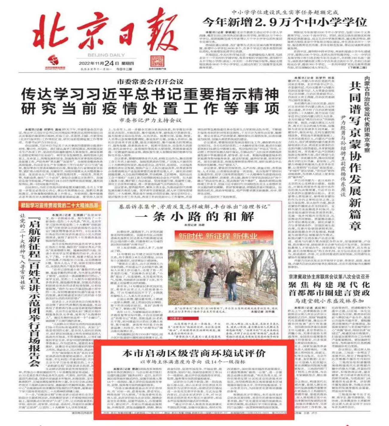 11月24日,北京日報頭版刊登了《全市啟動區級營商環境試評價》報道文章。此次全市區級營商環境評價工作由北京市發展改革委負責組織實施,并委托咨詢公司作為評價工作的牽頭承擔單位具體開展實施。